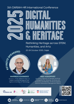 From 22 to 24 October 2025, the 5th DARIAH-HR Conference “Digital Humanities & Heritage” will be held in Osijek, organised by the Institute of Ethnology and Folklore Research / DARIAH-HR, the Academy of Arts and Culture in Osijek, and the Faculty of Agrobiotechnical Sciences Osijek. Under the theme Rethinking Heritage across STEM, Humanities, and Arts, the conference seeks to foster dialogue between diverse disciplines and create space for critical reflection on the role of digital technologies in cultural heritage, research practices, and artistic creation.
